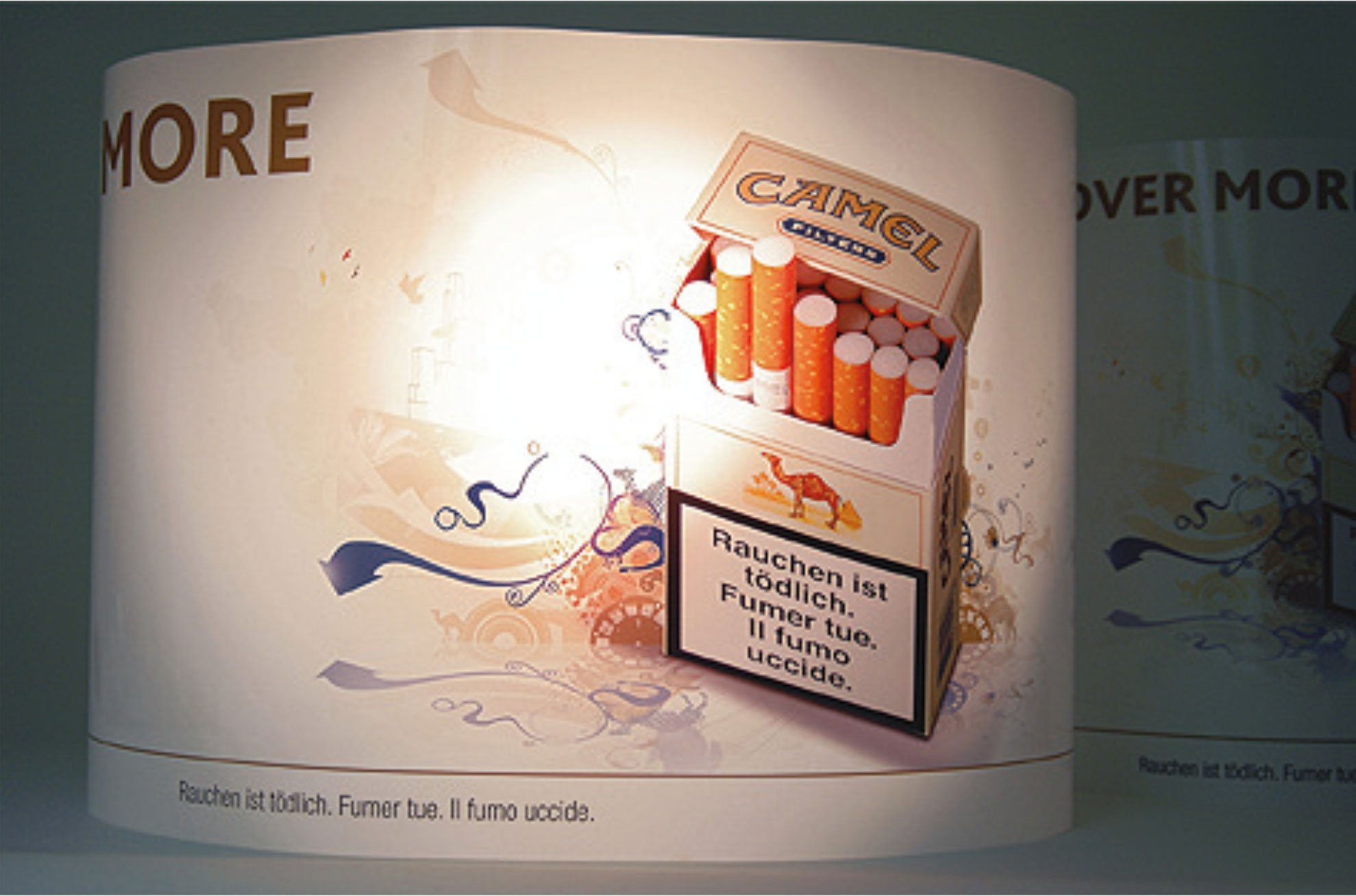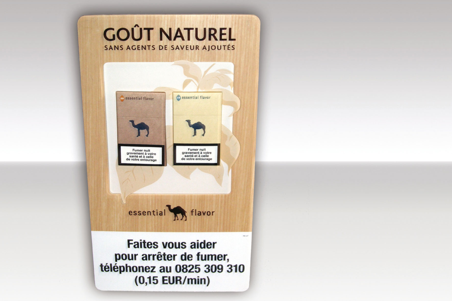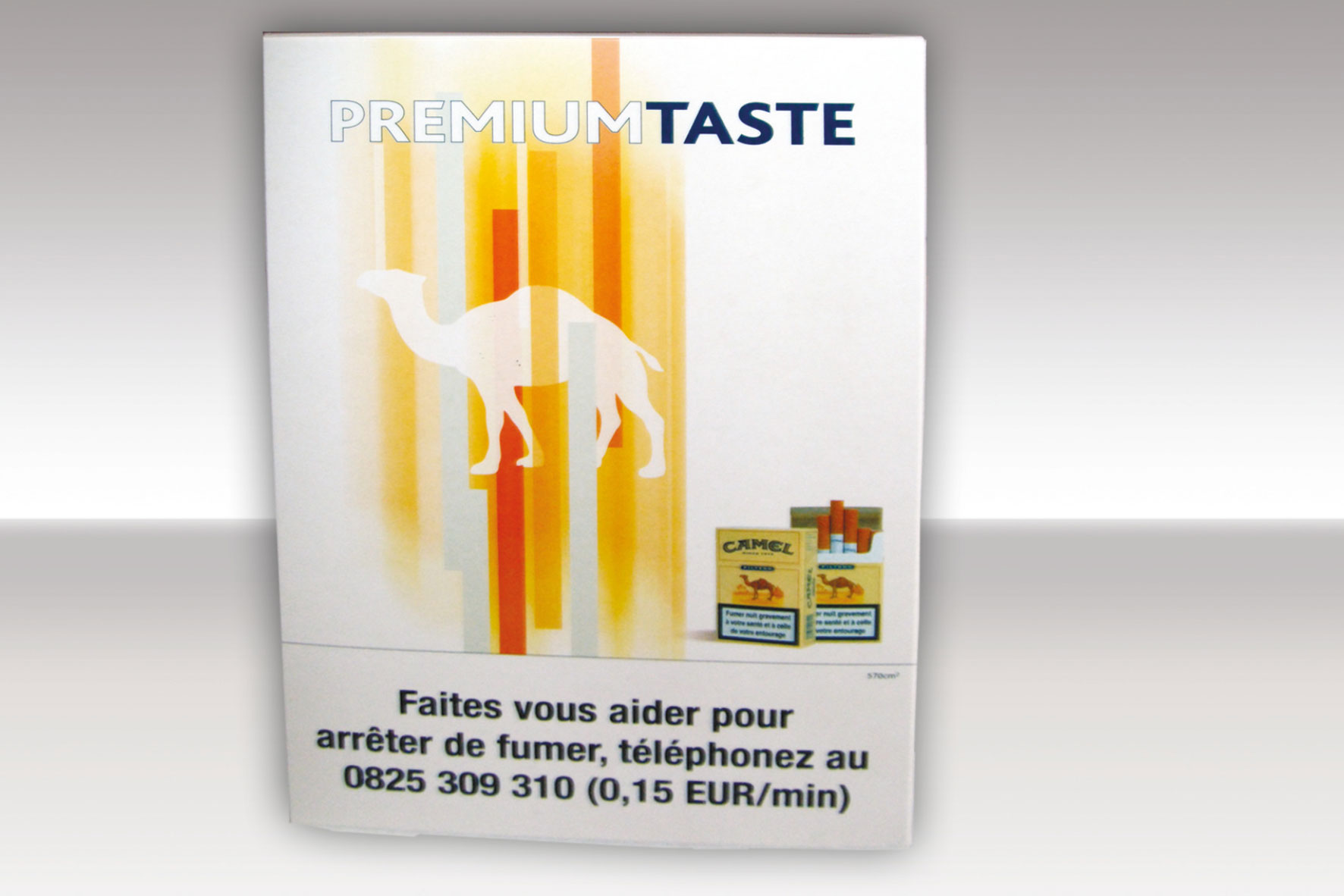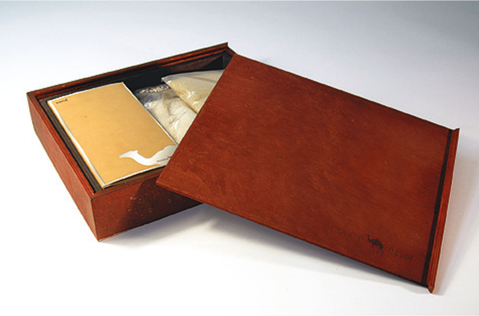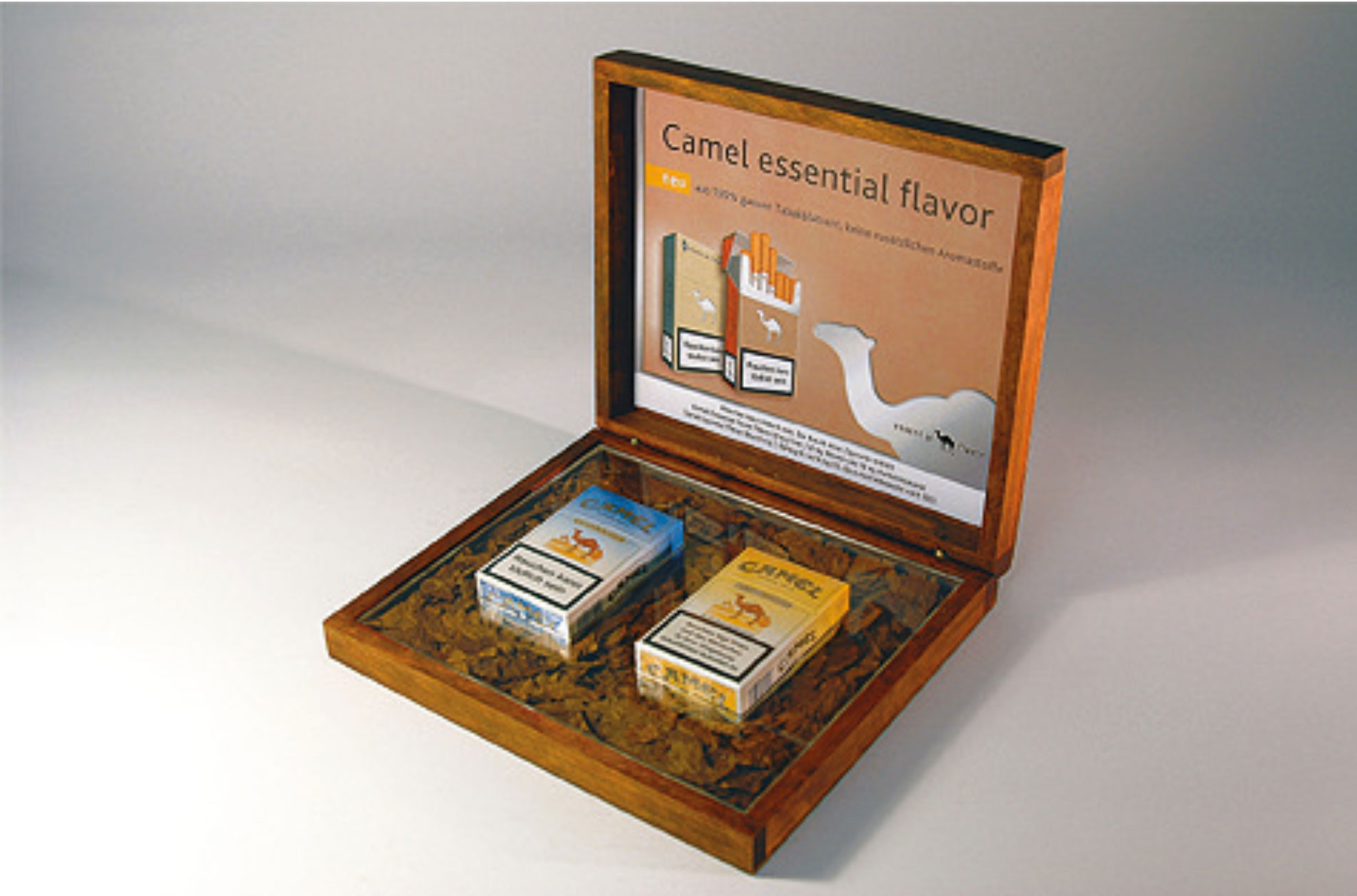 Der Tabak wurde in einer hochwertigen Präsentationsbox aus Buchenholz unter einer Acrylglasscheibe präsentiert. Die Box ist im Pantone Ton 4635c gebeizt. Die Beziehung zum Verkaufsprodukt wurde durch Einlegen zweier handelsüblicher Schachteln Zigaretten und ein im Innendeckel eingeklebtes Visual hergestellt, welches die Tabakmarke zeigt. Auf der Außenseite des Deckels wurde zusätzlich das Logo – CAMEL- der Marke eingefräst und mit einem gestanzten Camel-Offsetdruck silber- versehen.