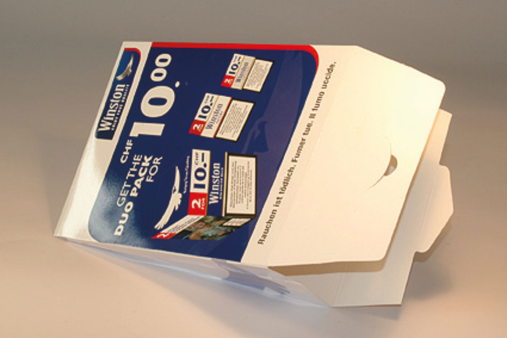 Die Verpackung wurde von bks production gmbh konstruiert und gefertigt. Dabei war der Anspruch des Kunden, dass sowohl 2 Schachteln Zigaretten als auch in einigen Fällen ein Flyer im Format 5,5 x 8,5 cm mit 8 bzw. 16 Seiten beigelegt werden sollte. Die Faltschachtel wurde aus hochweißem Algro- Design Karton 270 g/m² gefertigt und 5/0 farbig bedruckt. Das Format der Verpackung ist geschlossen 57 x 49 x 89,5 mm. Die Verpackung wurde flachliegend an den Konfektionär in die Schweiz geliefert.