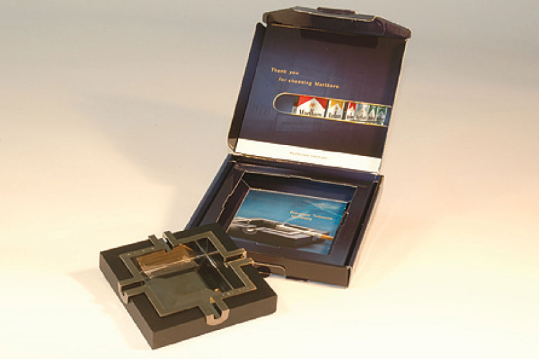 hochwertige Umverpackung als Kundenbindung, inclusive Give Away Aschenbecher gebrandet, incl. Anschreiben