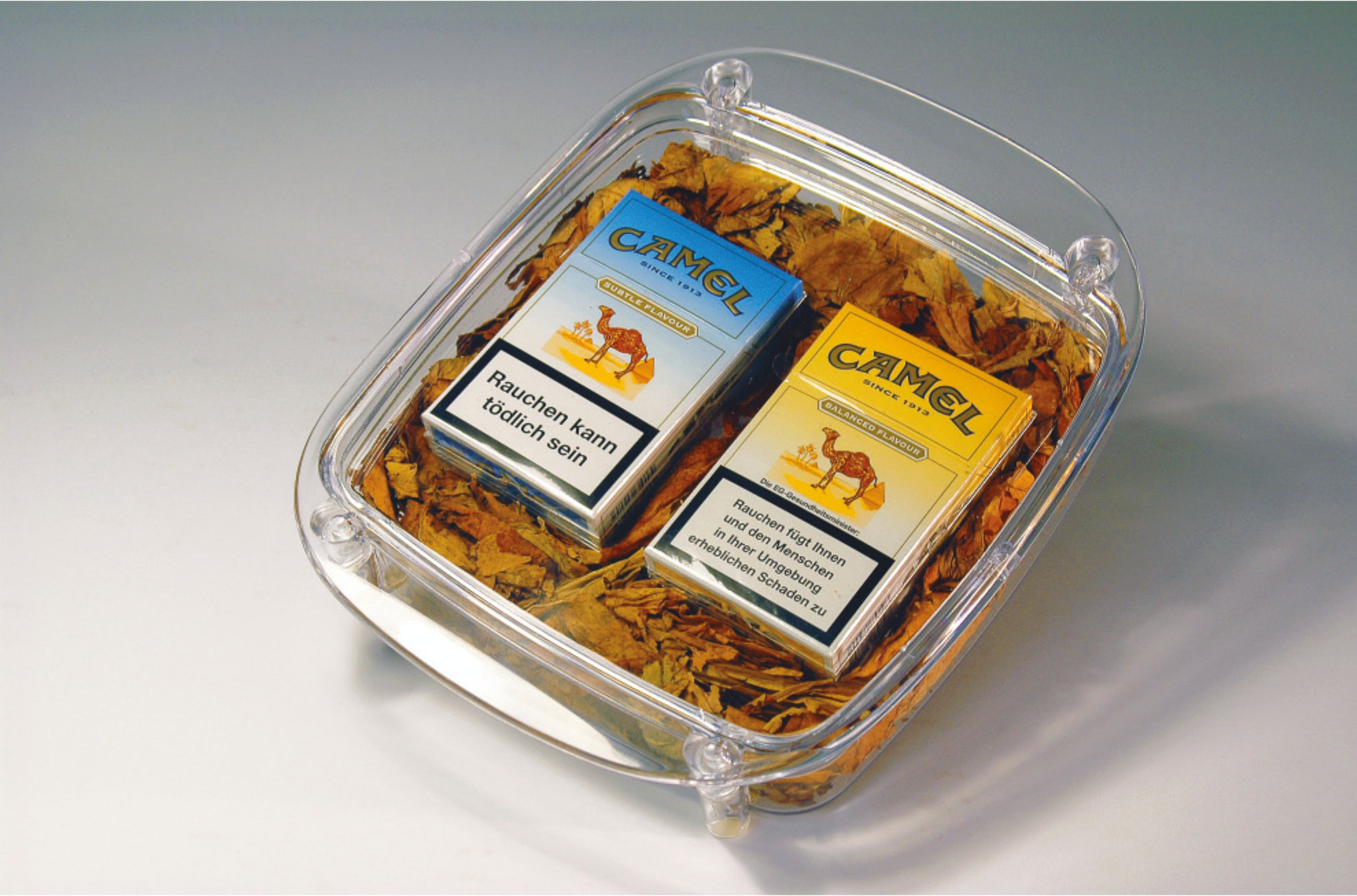 Es wurde ein Zahlteller gestaltet, bei dem neben zwei Schachteln der Marke, die präsentiert werden sollte, auch noch der lose Tabak gut sichtbar präsentiert wurde. Die Zahlteller aus Plexiglas wurden mit dem Tabak befüllt, Zigarettenschachteln eingelegt und dann mit einem Deckel aus Acrylglas so verschlossen, dass kein Tabak herausrieseln konnte.